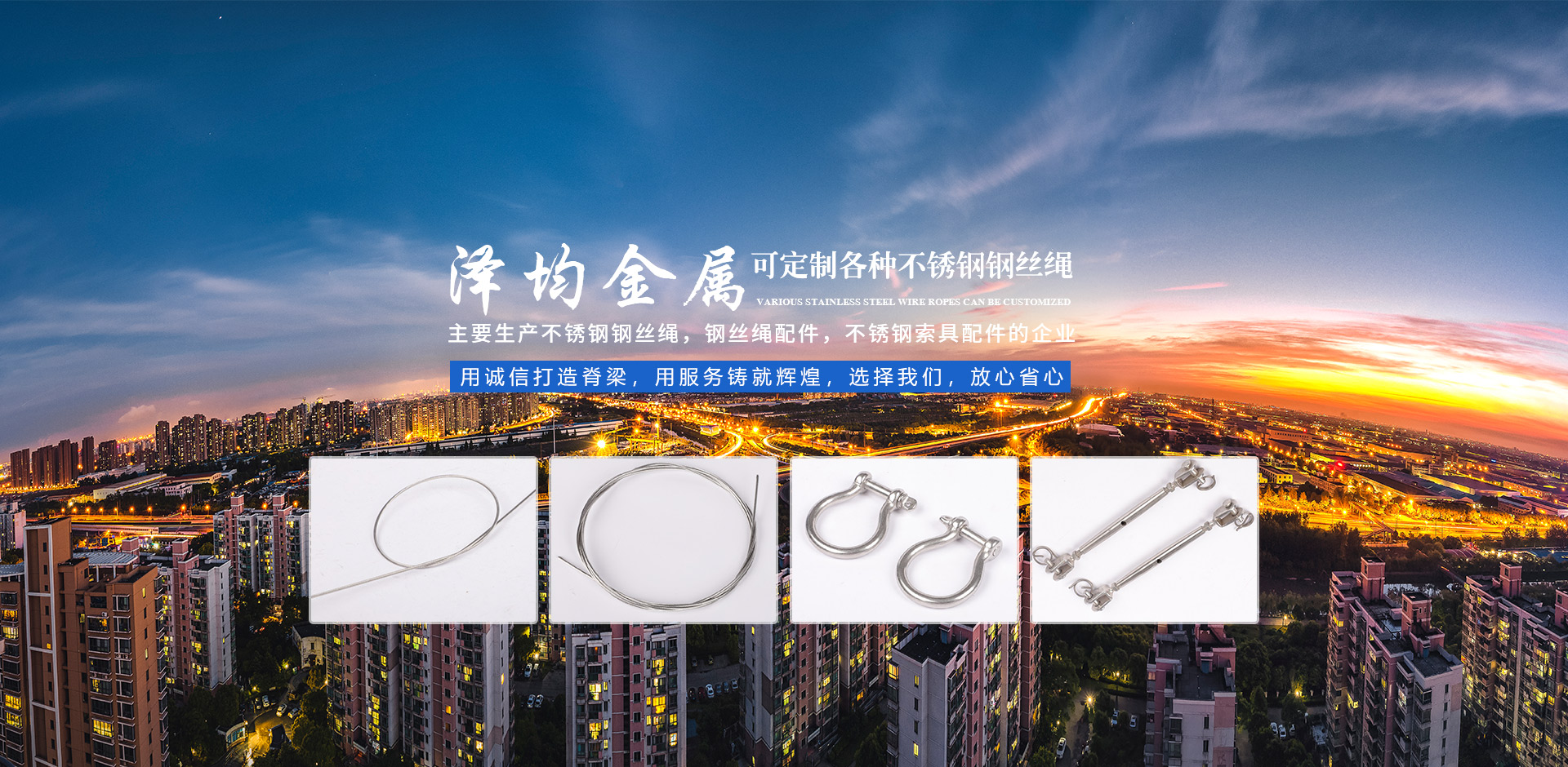 泰州市澤均金屬制品有限公司是一家生產不銹鋼鋼絲繩,鋼絲繩配件,不銹鋼索具配件的企業。 本廠主要生產各種型號鋼絲繩不銹鋼絲繩、涂塑不銹鋼絲繩、漁具鋼絲線、包膠不銹鋼絲繩、高強度不銹鋼絲繩、不銹鋼拉索、不銹鋼索具等。產品以304、304L、316、316L等不銹耐酸鋼為原料,生產鋼絲繩結構有單股繩(即1*7、1*12、1*19、1*37)、多股繩(即3*3、3*7、6*7、7*7、6*19、......